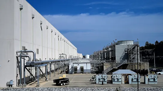 DownloadSteam rises above the cooling towers in The Dalles data center in Oregon. These plumes of water vapor create a quiet mist at dusk.
